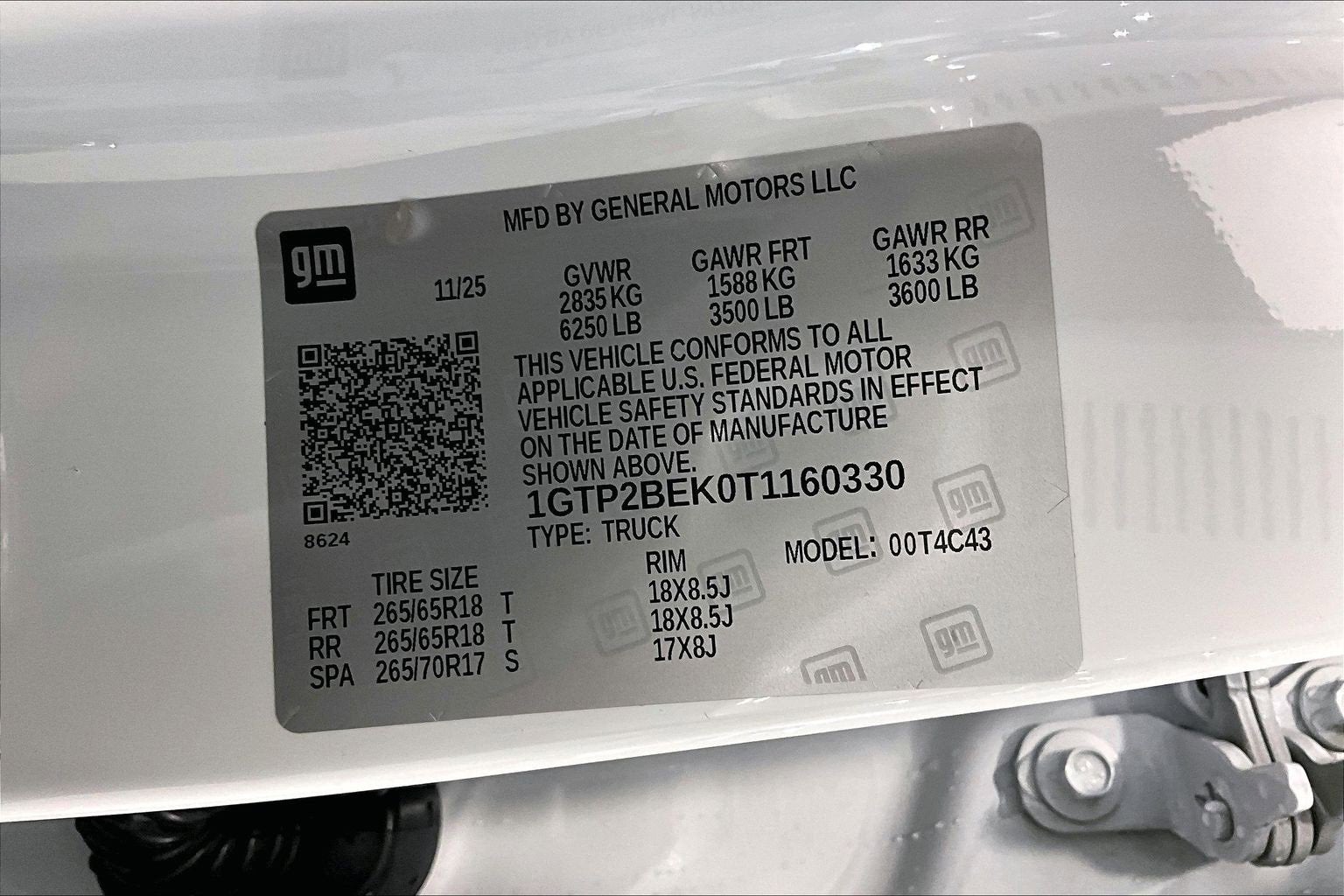 Summit White 2026 GMC Canyon Elevation 4WD 8-Speed Automatic 2.7L I4 Turbocharged DOHC 16V LEV3-SULEV30 310hp 4WD, 1 Rear USB Port in Center Console (Charge-Only), 120-Volt Bed Mounted Power Outlet, 2 1st Row USB Charge/Data Ports, 2 Rear USB Ports in Center Console (Charge-Only), 3.42 Rear Axle Ratio, 4-Way Manual Front Passenger Seat Adjuster, 4-Wheel Disc Brakes, 6 Speakers, 6-Speaker Audio System Feature, 6-Way Manual Driver Seat Adjuster, ABS brakes, Air Conditioning, Alloy wheels, AM/FM radio: SiriusXM with 360L, Apple CarPlay/Android Auto, Auto High-beam Headlights, Automatic Emergency Braking, Automatic Stop/Start, Black Badges, Black Badging Package, Black GMC Emblems, Blind Zone Steering Assist with Trailering, Brake assist, Bumpers: body-color, Canyon Pro Safety, Canyon Safety Plus Package, Cloth Seat Trim, Compass, Convenience Package, Delay-off headlights, Driver and Front Passenger Illuminated Visors, Driver door bin, Driver Mode Selector, Driver vanity mirror, Dual front impact airbags, Dual front side impact airbags, Dual-Zone Automatic Climate Control Air Conditioning, Electronic Stability Control, Emergency communication system: OnStar, EZ-Lift and Lower Tailgate, Following Distance Indicator, Forward Collision Alert, Front anti-roll bar, Front Bucket Seats, Front Center Armrest, Front LED Fog Lamps, Front Passenger Seatback Map Pocket, Front Pedestrian and Bicyclist Braking, Front wheel independent suspension, Heated door mirrors, Illuminated entry, Inside Rear-View Auto-Dimming Mirror, IntelliBeam Automatic High Beam on/Off, Interior Overhead Courtesy Light with Dual Reading Lamp, Lane Keep Assist with Lane Departure Warning, Low tire pressure warning, MultiStow Tailgate Storage Compartment, Navigation System, Occupant sensing airbag, Off-Road Suspension, Outside temperature display, Overhead airbag, Overhead console, Panic alarm, Passenger door bin, Passenger vanity mirror, Power door mirrors, Power steering, Power windows, Preferred Equipment Group 4VL, Radio data system, Radio: 11.3 Diagonal Premium GMC Infotainment System, Rear Cross Traffic Braking, Rear of Console 120-Volt Power Outlet, Rear reading lights, Rear step bumper, Rear window defroster, Remote keyless entry, Remote Vehicle Starter System, Security system, SiriusXM with 360L, Speed control, Speed-sensing steering, Split folding rear seat, Steering wheel mounted audio controls, Stop/Start System Disable Button Engine Control, Tachometer, Tailgate Keyed Cylinder Lock, Til and Telescopic Manual Steering Column, Tilt steering wheel, Traction control, Trip computer, Ultrasonic Rear Park Assist, Variably intermittent wipers, Wheels: 18 x 8.5 Gloss Black Finish Aluminum, Wireless Apple CarPlay/Wireless Android Auto, 4WD.