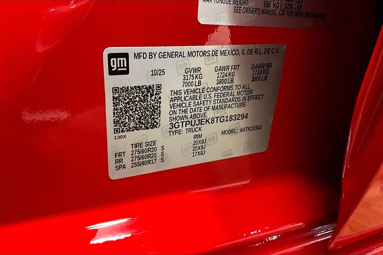Cardinal Red 2026 GMC Sierra 1500 Elevation 4WD 8-Speed Automatic 2.7L I4 Turbocharged DOHC 16V LEV3-SULEV30 310hp 8-Speed Automatic, 4WD, Jet Black Cloth, 10-Way Power Driver Seat Adjuster with Lumbar, 120-Volt Bed Mounted Power Outlet, 120-Volt Interior Power Outlet, 2 Charge/Data USB Ports, 2 Type-C Charge-Only Rear USB Ports, 220 Amp Alternator, 3.42 Rear Axle Ratio, 4-Way Manual Passenger Seat Adjuster, 4-Wheel Disc Brakes, 6 Speakers, 6-Speaker Audio System Feature, ABS brakes, Air Conditioning, Alloy wheels, AM/FM radio: SiriusXM with 360L, Apple CarPlay/Android Auto, Auto High-beam Headlights, Auto-Locking Rear Differential, Automatic Emergency Braking, Automatic temperature control, Body Color Header with Gloss Black Mesh Grille Bars, Brake assist, Buckle to Drive, Bumpers: body-color, Cloth Seat Trim, Color-Keyed Carpeting Floor Covering, Compass, Deep-Tinted Glass, Delay-off headlights, Driver door bin, Driver vanity mirror, Dual front impact airbags, Dual front side impact airbags, Electric Rear-Window Defogger, Electronic Stability Control, Emergency communication system: OnStar, Following Distance Indicator, Forward Collision Alert, Front 40/20/40 Split-Bench Seat, Front anti-roll bar, Front Center Armrest w/Storage, Front dual zone A/C, Front fog lights, Front Frame-Mounted Black Recovery Hooks, Front Pedestrian Braking, Front reading lights, Front Rubberized-Vinyl Floor Mats, Front wheel independent suspension, Fully automatic headlights, HD Rear Vision Camera, Heated door mirrors, Heated Driver and Front Outboard Passenger Seating, Heated front seats, Heated steering wheel, High Capacity Suspension Package, Hitch Guidance, Illuminated entry, Integrated Trailer Brake Controller, IntelliBeam Automatic High Beam on/Off, Keyless Open and Start, Lane Keep Assist with Lane Departure Warning, LED Cargo Area Lighting, Low tire pressure warning, Manual Tilt-Wheel and Telescoping Steering Column, Navigation System, Occupant sensing airbag, OnStar Services Capable, Outside temperature display, Overhead airbag, Overhead console, Panic alarm, Passenger door bin, Passenger vanity mirror, Power Door Locks, Power door mirrors, Power driver seat, Power Front Windows with Driver Express Up/Down, Power Front Windows with Passenger Express Down, Power Rear Windows with Express Down, Power steering, Power windows, Push Button Start, Radio data system, Radio: Premium GMC Infotainment Audio System, Rear reading lights, Rear Rubberized-Vinyl Floor Mats, Rear seat center armrest, Rear step bumper, Rear window defroster, Remote keyless entry, Remote Vehicle Starter System, Security system, SiriusXM with 360L Trial Subscription, Speed control, Speed-sensing steering, Split folding rear seat, Steering Wheel Audio Controls, Steering wheel mounted audio controls, Tachometer, Telescoping steering wheel, Theft Deterrent System (unauthorized Entry), Tilt steering wheel, Traction control, Trailering Package, Trip computer, Variably intermittent wipers, Voltmeter, Wheels: : 20 x 9 High Gloss Black Painted Aluminum, Wi-Fi Hotspot Capable, Wireless Apple CarPlay/Wireless Android Auto, 8-Speed Automatic, 4WD, Jet Black Cloth.