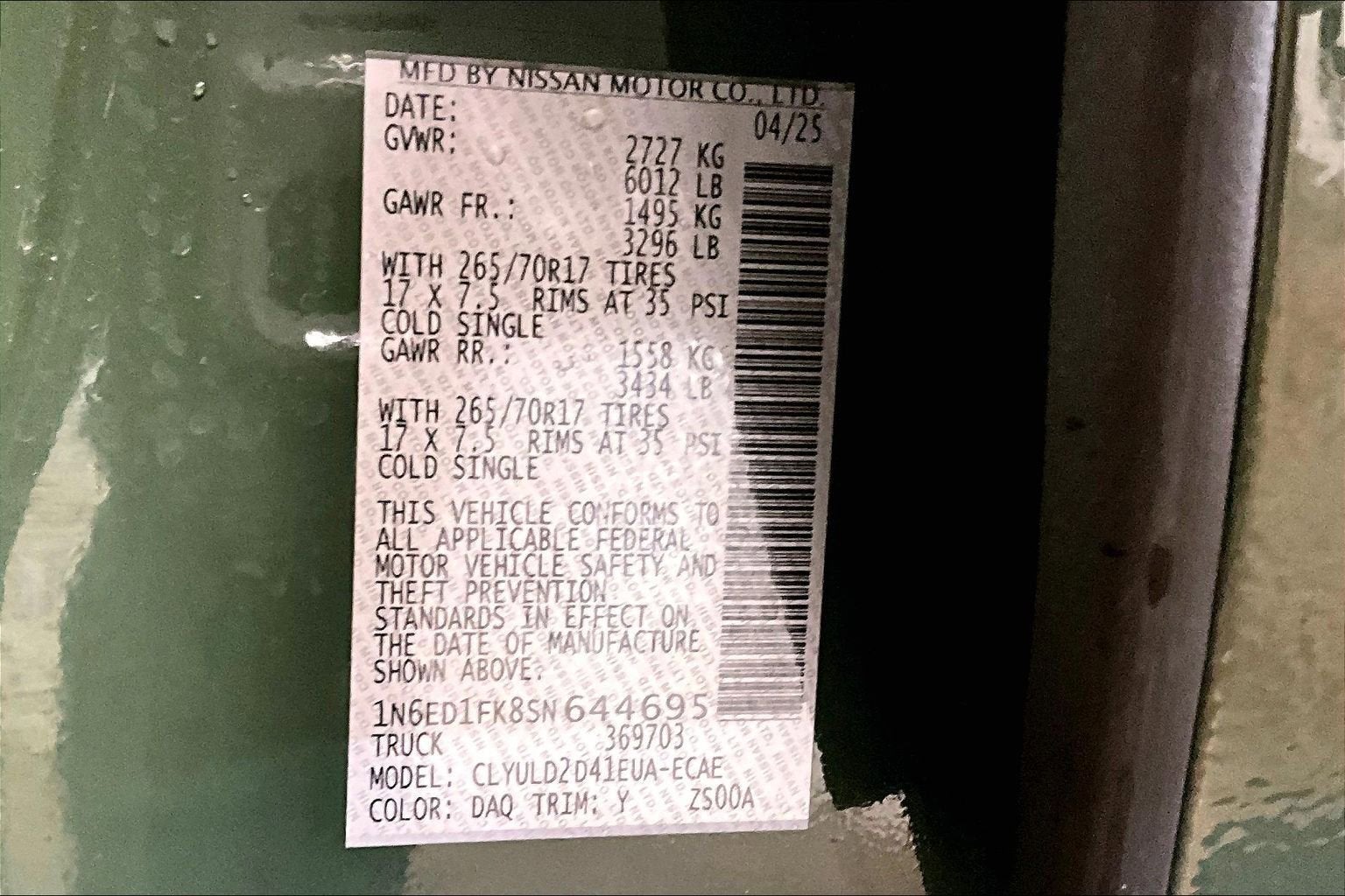 4WD, 120V Power Outlet in Bed, 120V Power Outlet in Rear Center Console, 17 Painted Alloy Wheels, 3.692 Axle Ratio, 4-Wheel Disc Brakes, 6 Speakers, ABS brakes, Air Conditioning, Alloy wheels, AM/FM radio: SiriusXM, Antenna Update, Anti-whiplash front head restraints, Auto High-beam Headlights, Auto-Dimming Mirror, Auto-Tilt & Slide Sunroof w/Manual Shade, Automatic temperature control, Bed Under-Rail Lighting, Blind Spot Warning, Brake assist, Bumpers: body-color, Delay-off headlights, Driver door bin, Driver vanity mirror, Dual front impact airbags, Dual front side impact airbags, Electronic Stability Control, Electronic Tailgate Lock, Emergency communication system, Essentials Kit, Fender Premium Audio System w/10 Speakers, Front anti-roll bar, Front Bucket Seats, Front Center Armrest, Front dual zone A/C, Front fog lights, Front reading lights, Front wheel independent suspension, Fully automatic headlights, Heated Front Seats, Heated Outside Mirrors, Heated Steering Wheel, HomeLink UGDO, Illuminated entry, Intelligent Around View Monitor (I-AVM), Knee airbag, Leather Seat Trim, Leather Shift Knob, Leather steering wheel, Low tire pressure warning, Mud Flap Accessory, Nissan Door-to-Door Navigation, Occupant sensing airbag, Off-Road Style Step Rails, Overhead airbag, Overhead console, Panic alarm, Partial Under-Seat Storage Delete, Passenger door bin, Passenger vanity mirror, Power door mirrors, Power driver seat, Power passenger seat, Power steering, Power windows, Premium Paint, PRO Convenience Package, PRO Embroidered Premium Cloth Seat Trim, PRO Premium Package, PRO-4X Carpeted Floor Mats (DISC), Radio data system, Radio: SXM/AM/FM/AUX/USB Audio System, Rear anti-roll bar, Rear seat center armrest, Rear side impact airbag, Rear step bumper, Remote Engine Starter, Remote keyless entry, Security system, Speed control, Speed-sensing steering, Split folding rear seat, Spray-In Bedliner, Steering wheel mounted audio controls, Tachometer, Telescoping steering wheel, Tilt steering wheel, Tow Package (T11) (DISC), Traction control, Traffic Sign Recognition (TSR), Trailer Hitch w/Wiring Harness, Trip computer, USB Charging Cable Kit, Utili-Track System, Variably intermittent wipers, Voltmeter, Wireless Apple CarPlay/Wireless Android Auto, Wireless Charging for Personal Devices, 4WD.