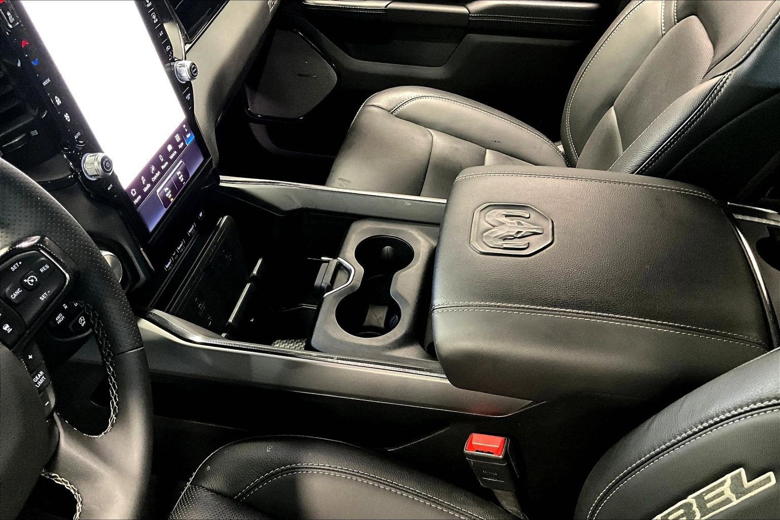 10 Speakers, 115V Auxiliary Rear Power Outlet, 2-Door Passive Entry, Front Door Locks, 3.92 Rear Axle Ratio, 4 Way Front Headrests, 4-Wheel Disc Brakes, 4G LTE Wi-Fi Hot Spot, ABS brakes, Accent Color Door Handles, Accent Color Premium Power Mirrors, Accent Color Tailgate Handle, Air Conditioning, Alloy wheels, AM/FM radio: SiriusXM with 360L, Apple CarPlay, Apple CarPlay/Android Auto, Auto High-beam Headlights, Auto Power-Folding Mirrors, Auto-Dimming Exterior Driver Mirror, Auto-dimming Rear-View mirror, Automatic temperature control, Bed Utility Group, Black Painted Exterior Mirrors Caps, Brake assist, Bucket Seats, Cloth/Vinyl Bucket Seats, Compass, Connected Travel & Traffic Services, Connectivity - US/Canada, Convex Wide-Angle Exterior Mirror Insert, Delay-off headlights, Driver door bin, Driver Seat Memory, Driver vanity mirror, Dual front impact airbags, Dual front side impact airbags, Dual Wireless Charging Pad, Electronic Stability Control, Exterior 115V AC Outlet, Exterior Mirrors Approach Lamps, Exterior Mirrors Courtesy Lamps, Exterior Mirrors w/Heating Element, Exterior Mirrors w/Memory, Exterior Mirrors w/Supplemental Signals, Front anti-roll bar, Front Bucket Seats, Front Center Armrest w/Storage, Front dual zone A/C, Front fog lights, Front License Plate Bracket, Front Passenger Interactive Display, Front reading lights, Front Seat Back Map Pockets, Front wheel independent suspension, Full Length Upgraded Floor Console, Fully automatic headlights, Garage door transmitter, Google Android Auto, GPS Antenna Input, GPS Navigation, harman/kardon 19 Speaker Premium Sound, HD Radio, Heated door mirrors, Heated front seats, Heated Second Row Seats, Heated steering wheel, Illuminated entry, Integrated Voice Command w/Bluetooth®, Leather steering wheel, Low tire pressure warning, Manual Folding Exterior Mirrors, Media Hub w/2 Charge Only USBs, MOPAR 4 Adjustable Cargo Tie-Down Hooks, Mopar Black Tubular Side Steps, MOPAR Spray In Bedliner, Navigation System, Occupant sensing airbag, Off-Road Information Pages, Outside temperature display, Overhead airbag, Overhead console, Panic alarm, ParkView Rear Back-Up Camera, Passenger door bin, Passenger vanity mirror, Power Adjust 8-Way Driver Seat, Power Adjust 8-Way Front Passenger Seat, Power Adjustable Pedals w/Memory, Power door mirrors, Power driver seat, Power steering, Power Tailgate, Power windows, Proximity Approach/Departure Lamps, Quick Order Package 21W Rebel, Radio data system, Radio: Uconnect 5 Nav w/12.0 Display, Radio: Uconnect 5 Nav w/14.4 Display, Radio/Driver Seat/Mirrors/Pedals Memory, Rain Sensitive Windshield Wipers, Rear 60/40 Folding Seat, Rear anti-roll bar, Rear seat center armrest, Rear step bumper, Rear Window Defroster, Rebel Level 2 Equipment Group, Remote keyless entry, Security Alarm, SiriusXM w/360L, Smartphone As A Key Capable, Speed control, Split folding rear seat, Steering wheel mounted audio controls, Tachometer, Telescoping steering wheel, Tilt steering wheel, Traction control, Trip computer, USB Host Flip, Variably intermittent wipers, Voltmeter, Wheels: 18 x 8.0 Painted Mid-Gloss Black.